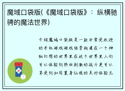 魔域口袋版(《魔域口袋版》:纵横驰骋的魔法世界)